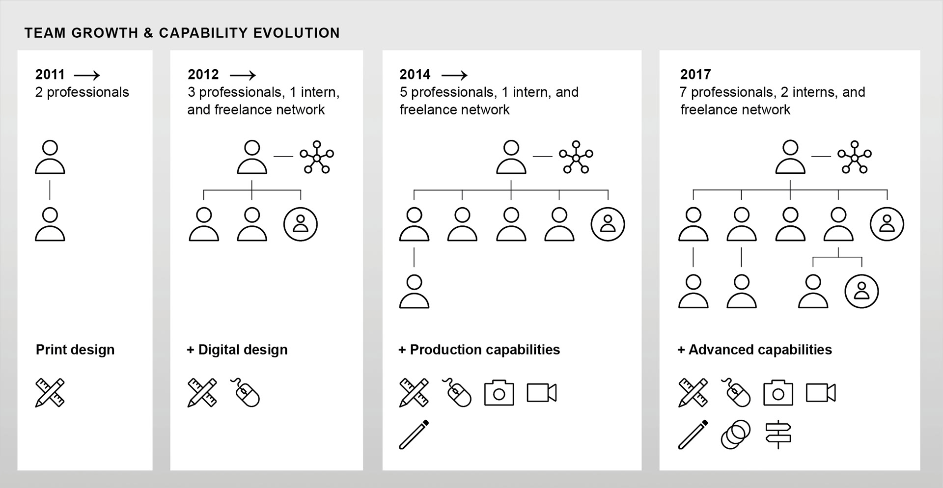 • Scaled team capacity 3.5x (from 2 to 7 professionals) while simultaneously increasing creative output 5x and establishing award-winning quality standards