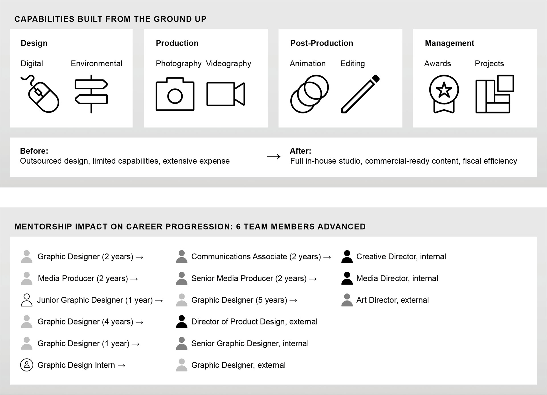 • Capability building and internal expertise development establishing photo and video production from ground up with training and equipment investment