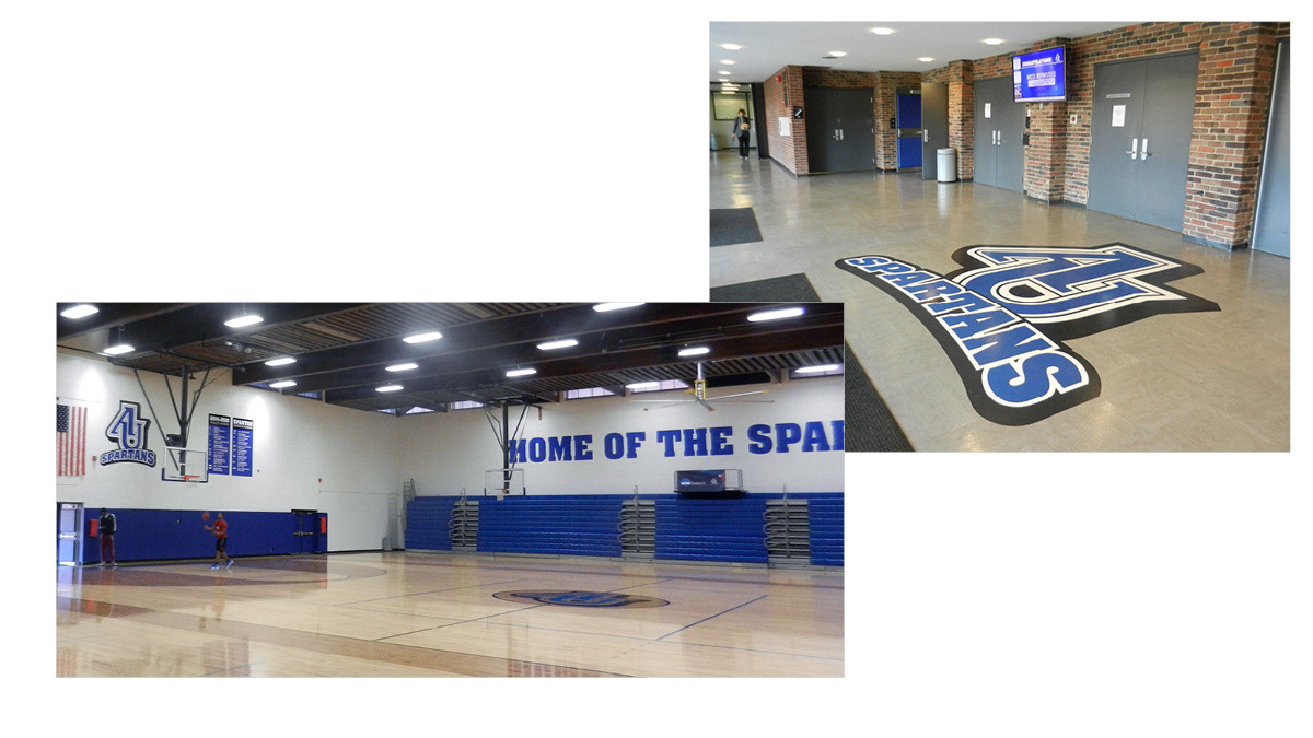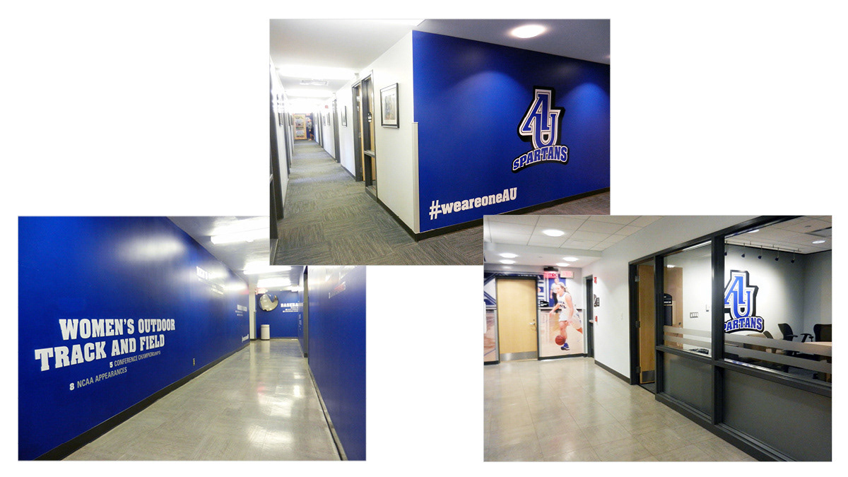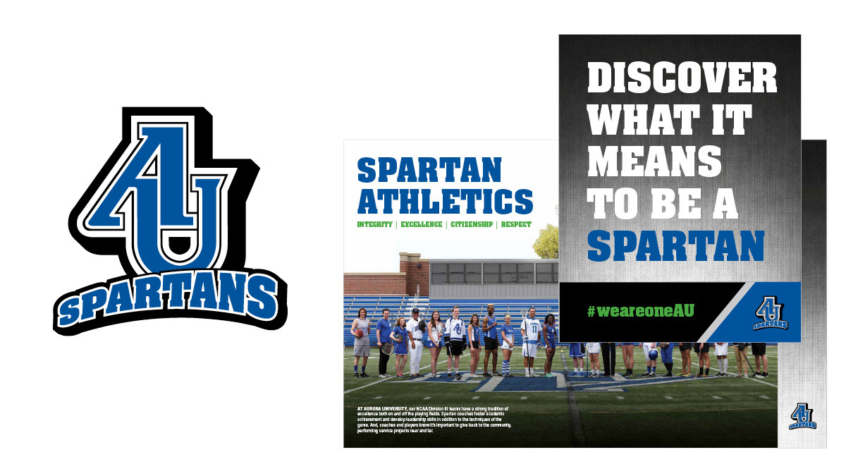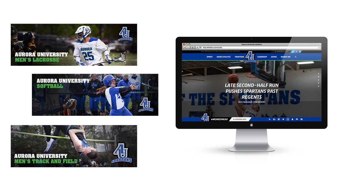 • Successfully deployed across the complete physical environment of Aurora University athletics: hallways, gym floors, locker rooms, arena walls, outdoor signage, and athletic apparel
