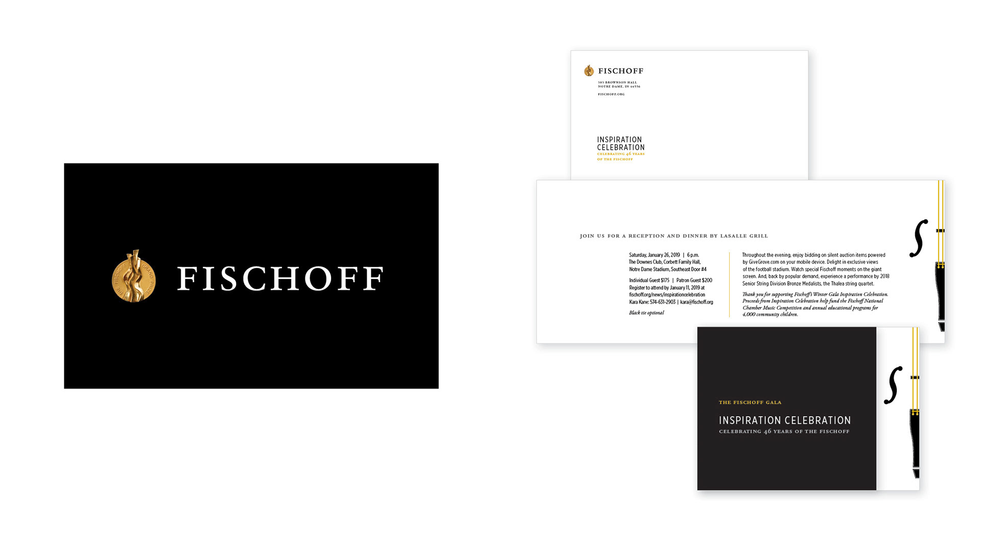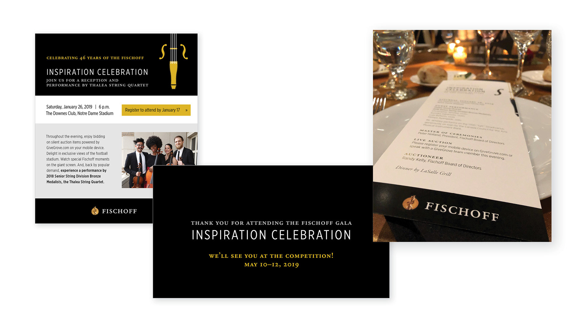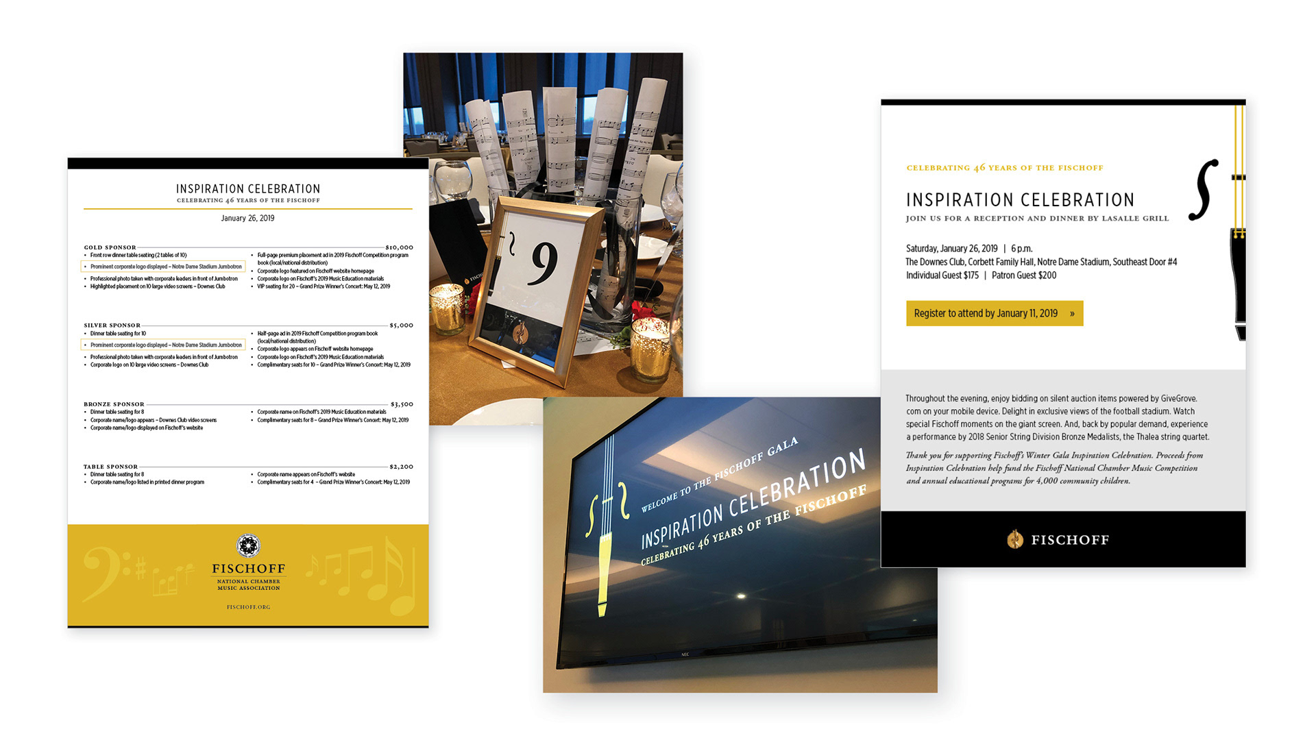 • The Fischoff National Chamber Music Association — a prestigious nonprofit organization within the University of Notre Dame — needed to refresh the identity and experience of its annual fundraising gala, Inspiration Celebration, one of the organization’s most important revenue events