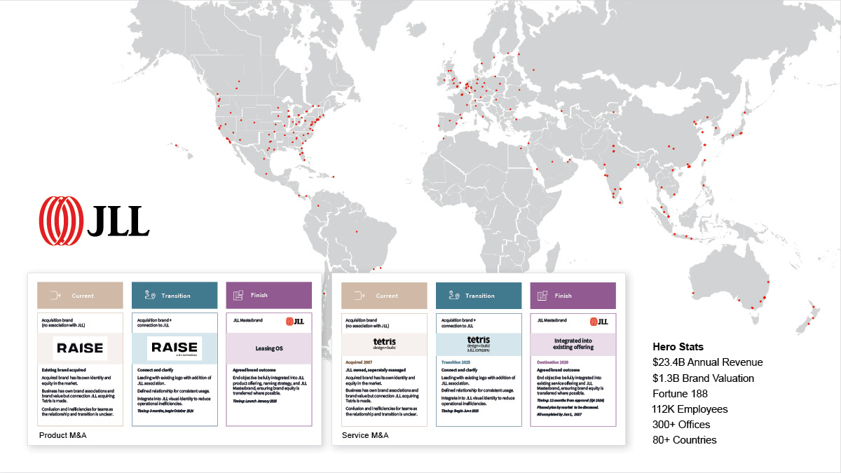 • Managing brand equity for a $1.3B Fortune 200 commercial real estate brand across 112K employees in 300+ offices in 80+ countries while maintaining brand coherence
