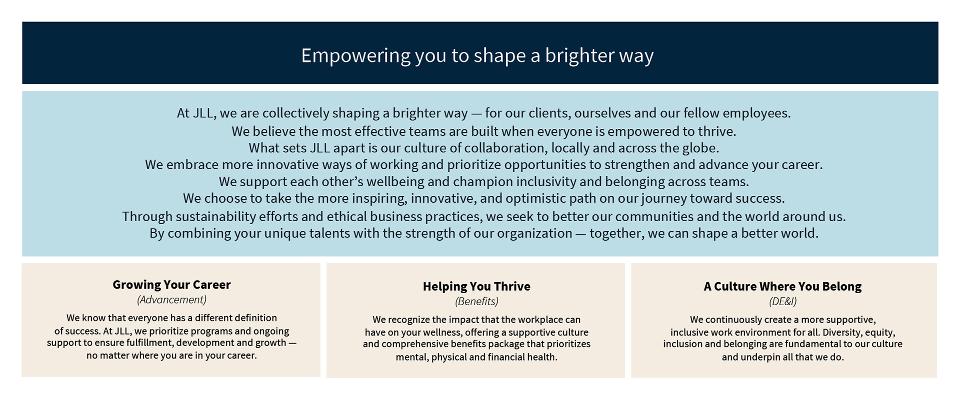 • Developed breakthrough Employee Value Proposition (EVP) “Empowering you to shape a brighter way” positioning JLL as employer of choice for purpose-driven professionals strategically aligning with our global brand strategy: See a brighter way